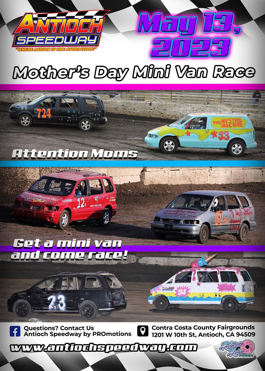 Hello Mom's of any age, no matter how many times you have hit 21, if your a Mom get a hold of a Mini Van and get out to Antioch Speedway on May 13th, 2023 and participate in the 3rd Annual Mother's Day Mini Van Race. Who is going to be the champion for 2023? It could be YOU.