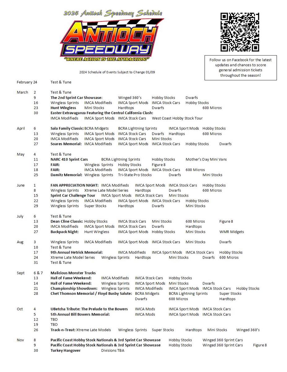 Antioch Speedway is pleased to announce our 2024 racing schedule. We look forward to having our amazing fans, drivers, divisions, series, teams, crew members, officials and of course the DNF Crew back for another full racing season at Antioch Speedway. Thank you all for being a part of the Antioch Speedway team/family!