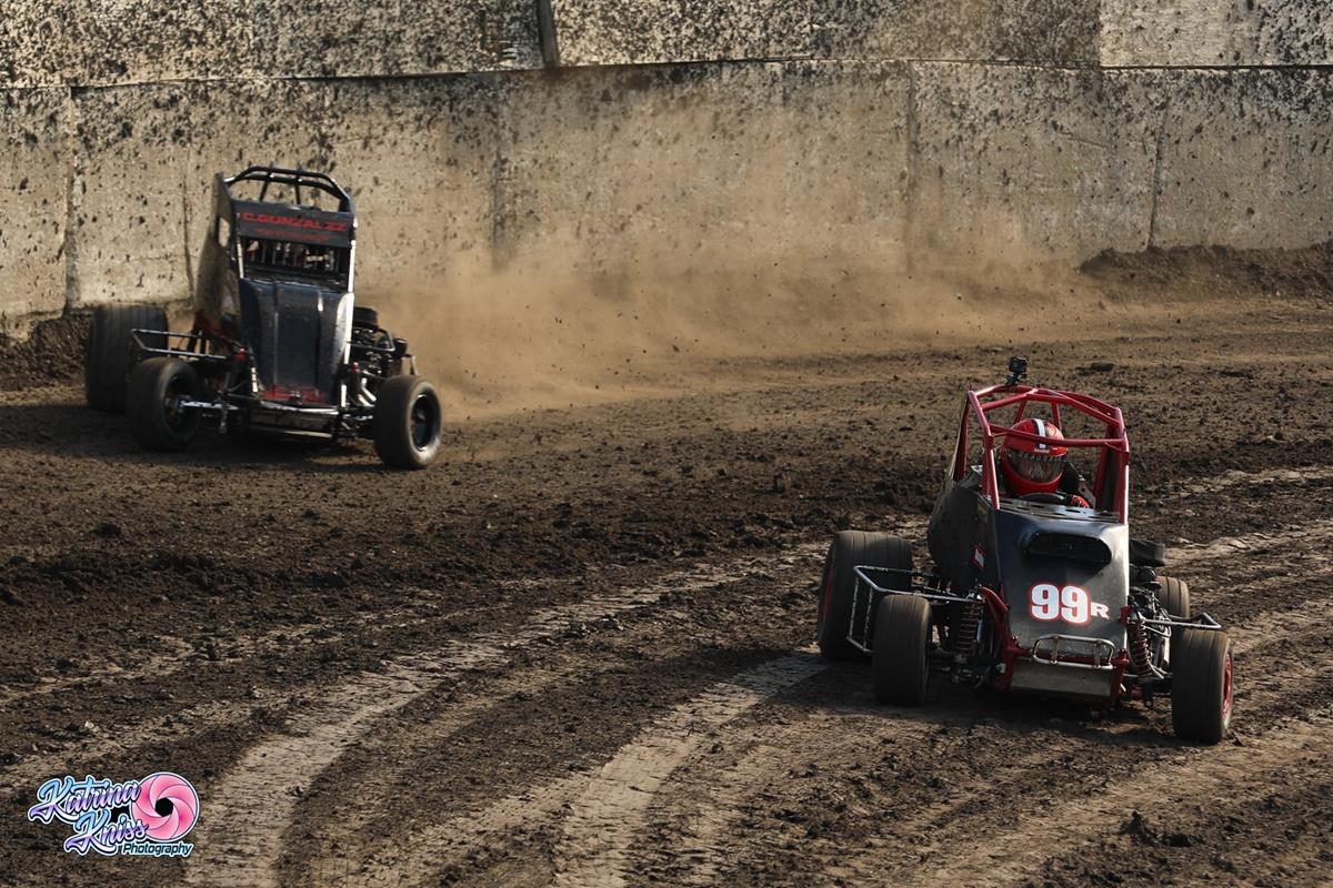 Cameron Gonzalez #c28 and Buddy Chappell #99 in Micro Sprint action. Photo by Katrina Kniss