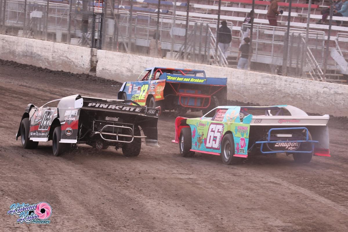Reigning Super Stock champion Ryan Cherezian #12, Antonio Aragon #055 and Danneeka Garretson #65 racing down the straightaway at last year's Larry Damitz Memorial. Photo by Katrina Kniss