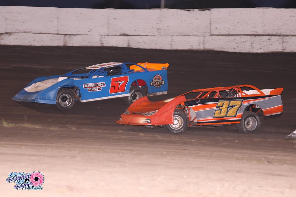 Late Model point leader Rod Oliver #57 and Ray Trimble #37 are looking for a Larry Damitz Memorial win. Photo by Katrina Kniss