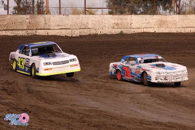 IMCA Stock Car rookie Jake Archibald #43 and Kenneth Robles #78k battle side by side. Photo by Katrina Kniss