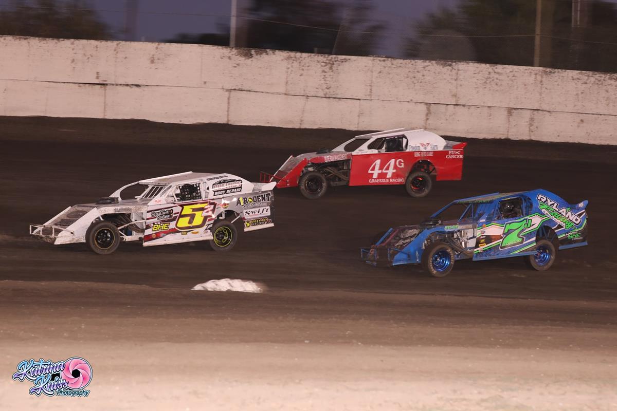 IMCA Sport Modified racers Jason Ryan Jr #52, James Grassle #44g and Fred Ryland #7j. Photo by Katrina Kniss