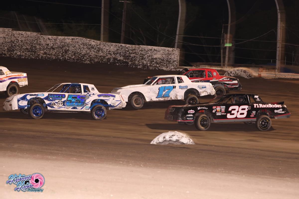 Close Hobby Stock racing between Hunter Hammett #55h, Kevin Brown #17b, Todd Gomez #38 and Charlie Bryant #11a. Photo by Katrina Kniss