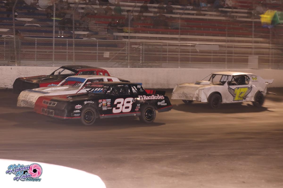 Hobby Stock racers Todd Gomez #38, Aidan Ponciano #225, Charlie Bryant #11a and Lily Mead #17 in a close battle. Photo by Katrina Kniss