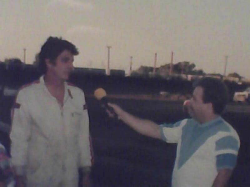 Antioch Speedway Hall of Famer Mike Conley being interviewed by announcer Butch Althar after a Trophy Dash win in 1989. Photo by Candice Martin