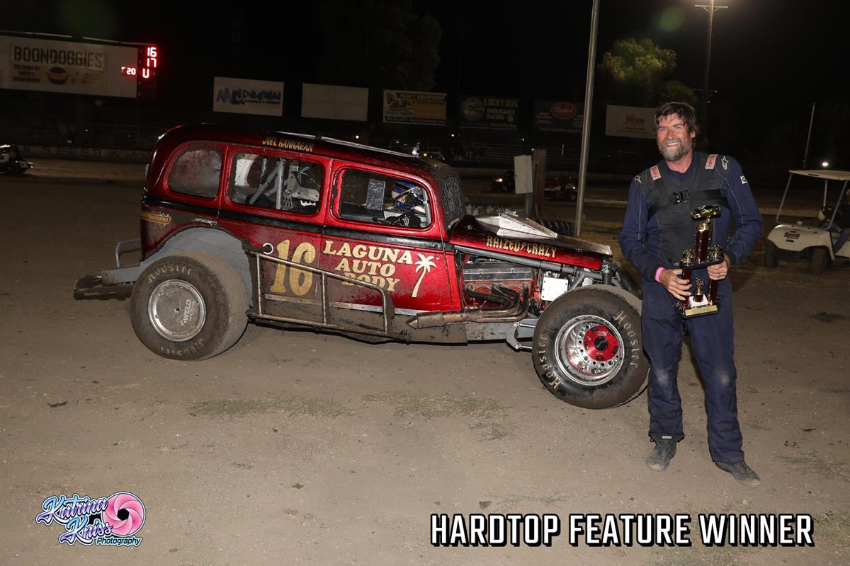 Joel Hannagan of San Jose won a mid-race battle with Merced Speedway champion Mike Gillard of Atwater before going on to collect his fifth 20 lap Hardtop Main Event win of the season. This was also the Fourth Annual Butch Althar Memorial race and Hannagan's second win in that event aboard the Doug Braudrick owned Junkyard Dog Hardtop.