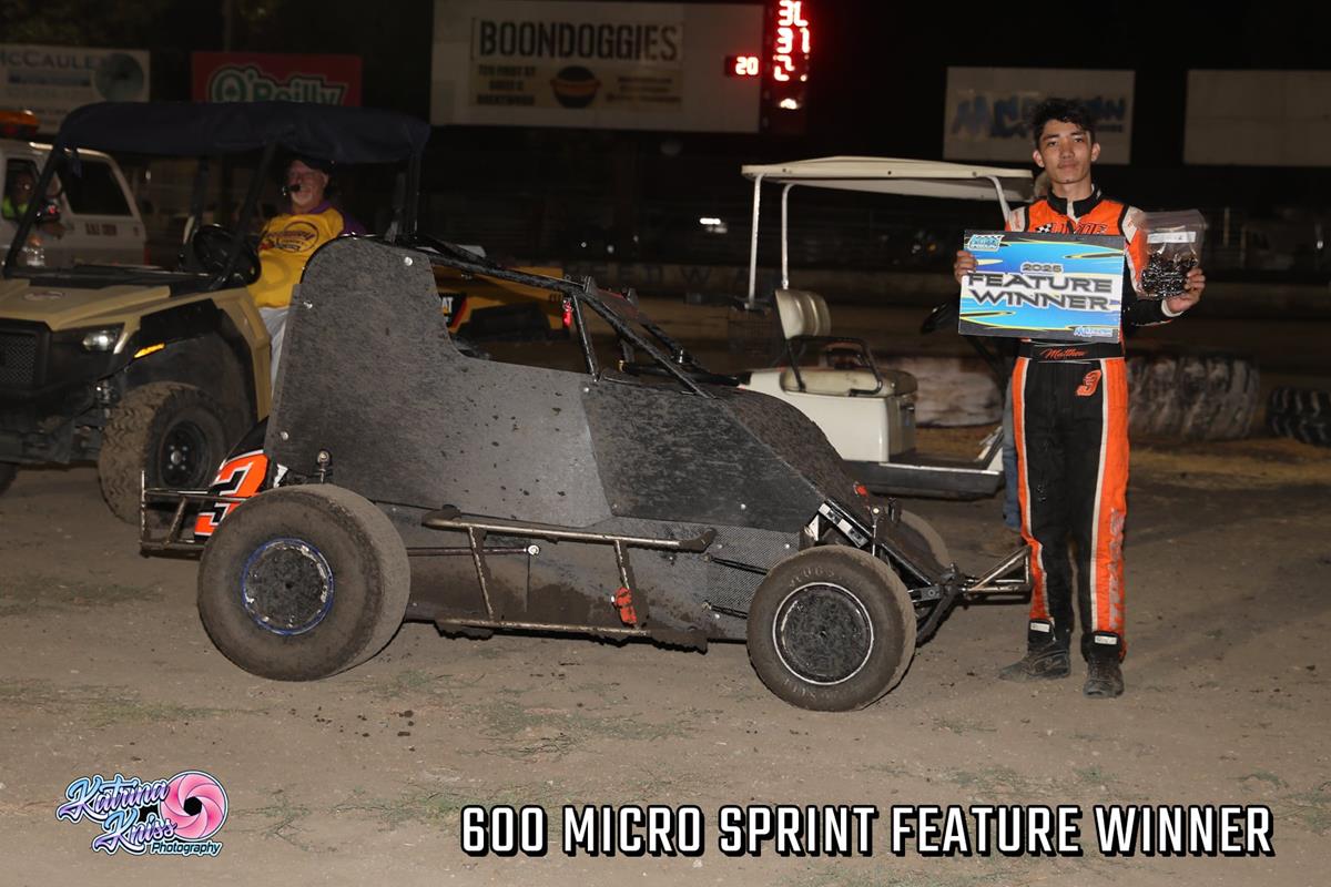 Pittsburg's Matthew Linde won a race long battle with heat race winner Devin Zuffa of Oakley and Petaluma Speedway champion Peyton Gentry of Santa Rosa to win the 20 lap 600 Micro Sprint Main Event. The race went without a yellow flag and featured a non-stop battle for the lead.