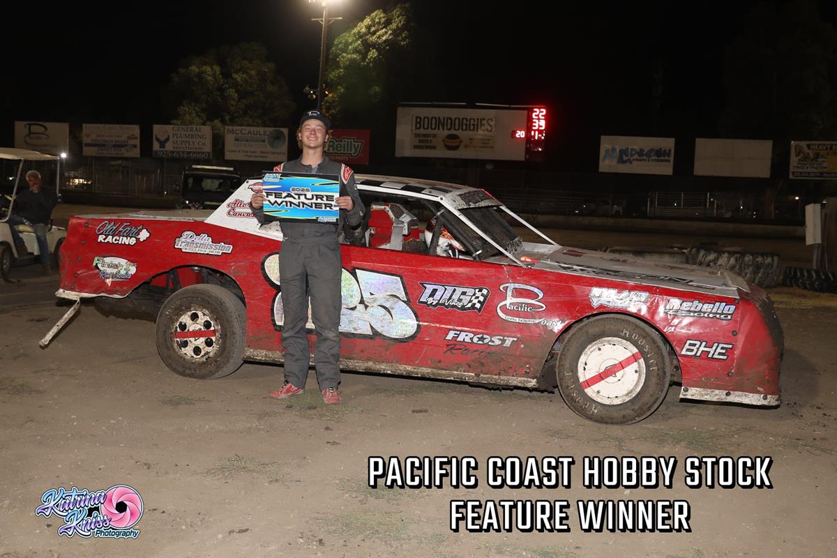 Aidan Ponciano of Oakley outdueled Brentwood's Grayson Baca to win the 20 lap Pacific Coast Hobby Stock Main Event. This was the third win of the season for Ponciano, and it moved him into fifth in the standings.